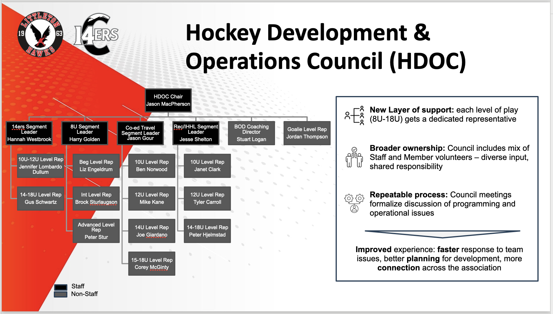 The Hockey Development & Operations Council (HDOC) is a key part of Littleton Hockey Association’s commitment to enhancing communication, transparency, and support across all levels of play. This council is composed of staff and dedicated volunteers who work together to guide the planning and execution of LHA’s hockey programs — from player development and coaching support to team structure and season operations.