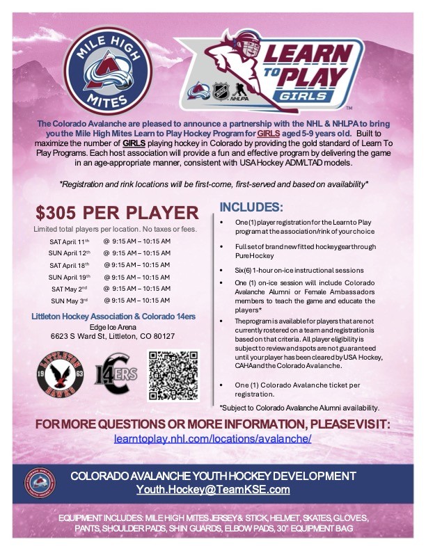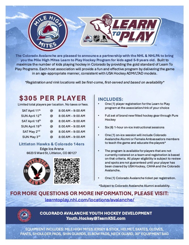 The Mile High Mites program is set up by the Colorado Avalanche that Littleton Hockey runs. This program upon registration provides gear for each player and is geared towards first time skaters.We will Keep this page up to date with registration links when the next session becomes available. The link to sign up is below.